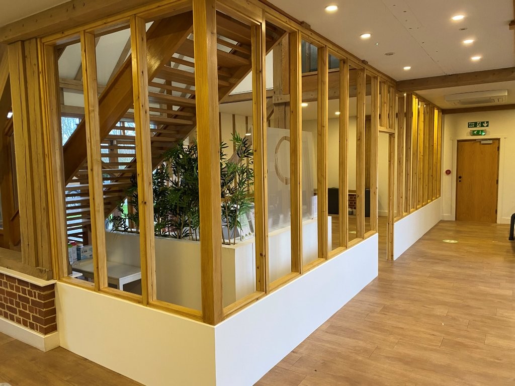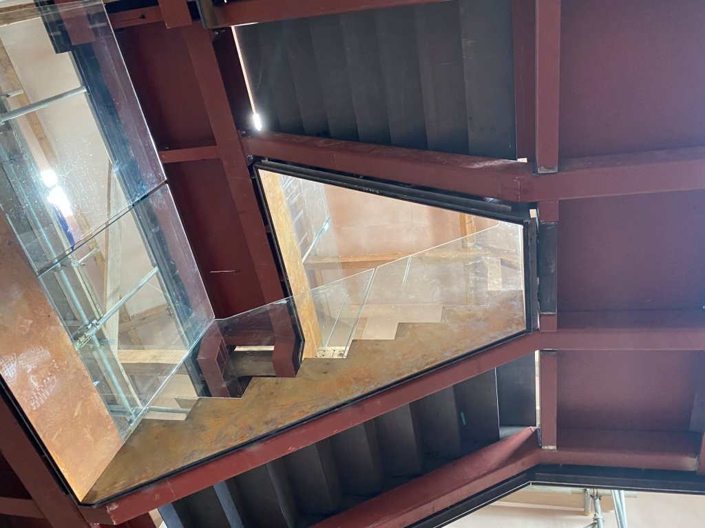 The height and space within the barns give a lovely bright and open working environment. One of the highlights and more technical aspects of the build was the staircase into one of the entrances. With the design being brushed mild steel with glass handrails and balustrading gives a modern and industrial finish in keeping with the site.
