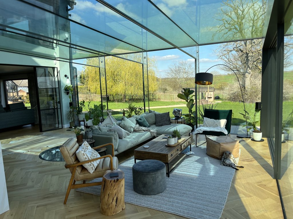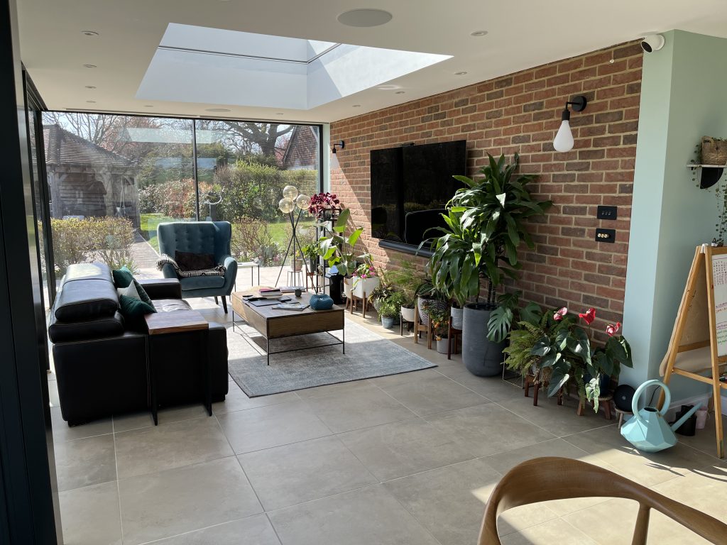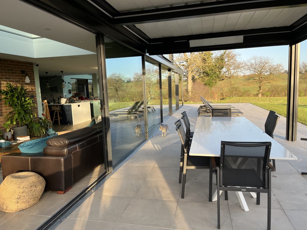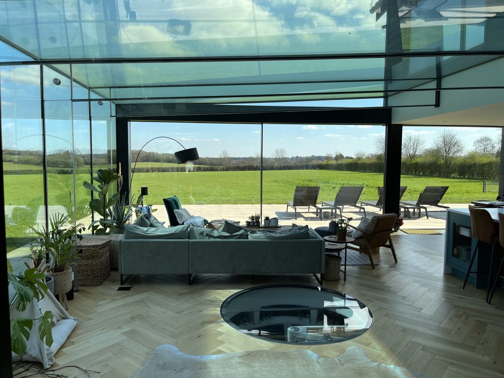 This is a private residence set within the Hertfordshire countryside. The works consisted of extending the property along the rear elevation, enlarging the living area and utility room. The design of the living area with full height glass walls, glass sliding doors and a glass roof makes the most of the stunning views of the countryside. Furthermore, the floor and terrace finishes match, which adds to the seamless link from inside to out. The works also involved adding solar panels to the outbuildings and upgrading the ground source heat pump. These additions as well as the solar gain of the extension will help the property run more efficiently.