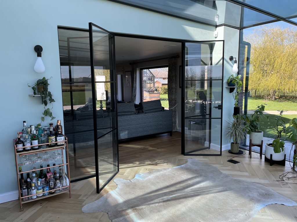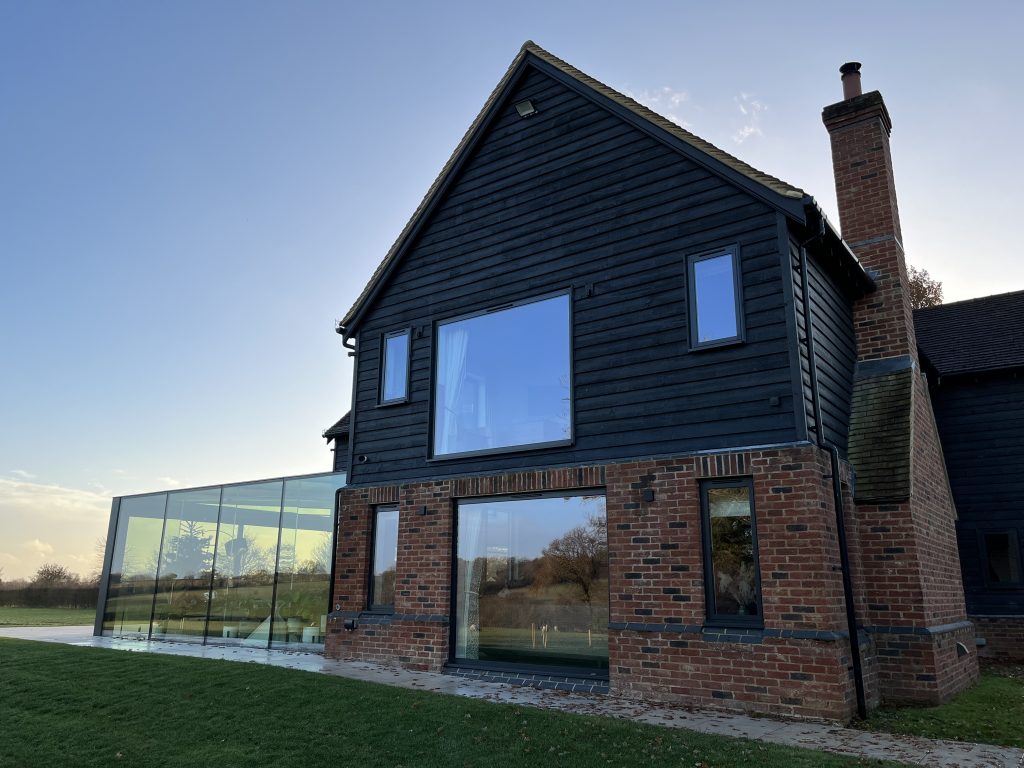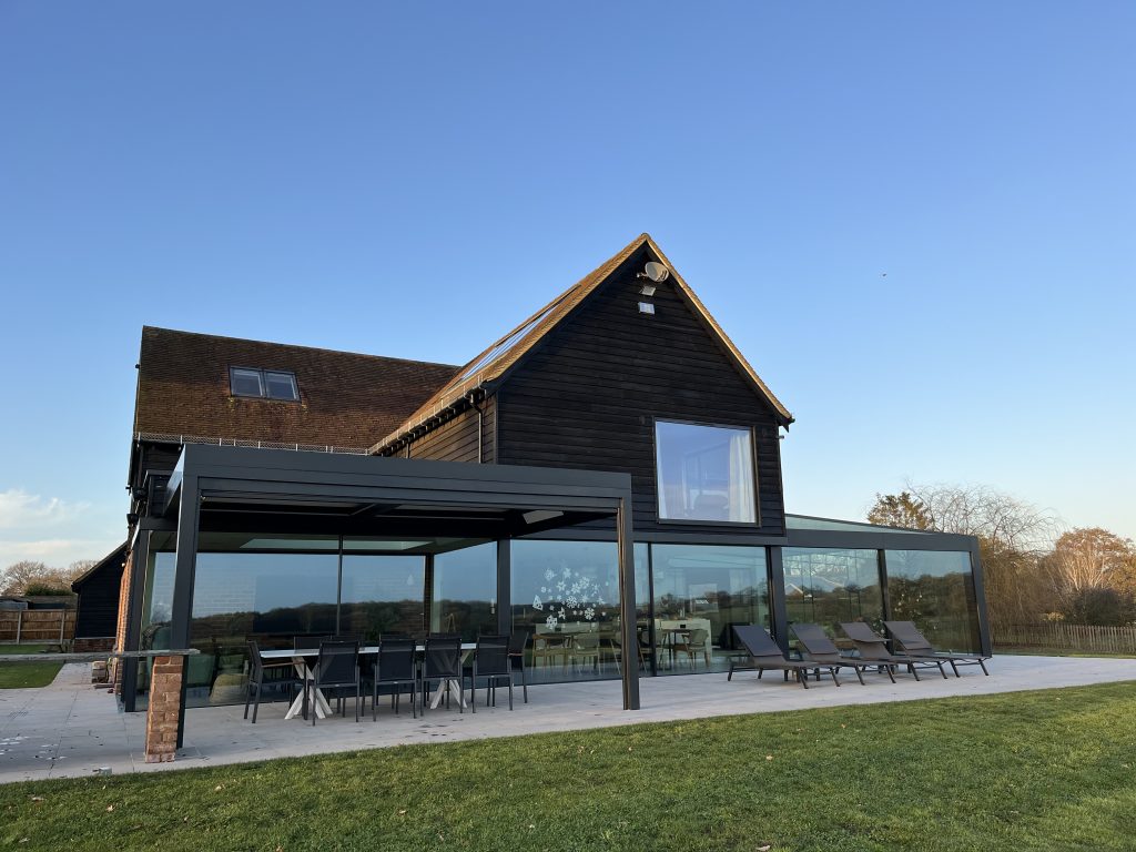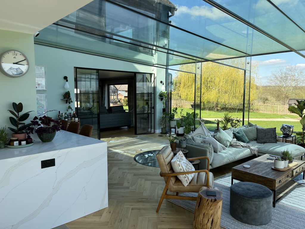 This is a private residence set within the Hertfordshire countryside. The works consisted of extending the property along the rear elevation, enlarging the living area and utility room. The design of the living area with full height glass walls, glass sliding doors and a glass roof makes the most of the stunning views of the countryside. Furthermore, the floor and terrace finishes match, which adds to the seamless link from inside to out. The works also involved adding solar panels to the outbuildings and upgrading the ground source heat pump. These additions as well as the solar gain of the extension will help the property run more efficiently.