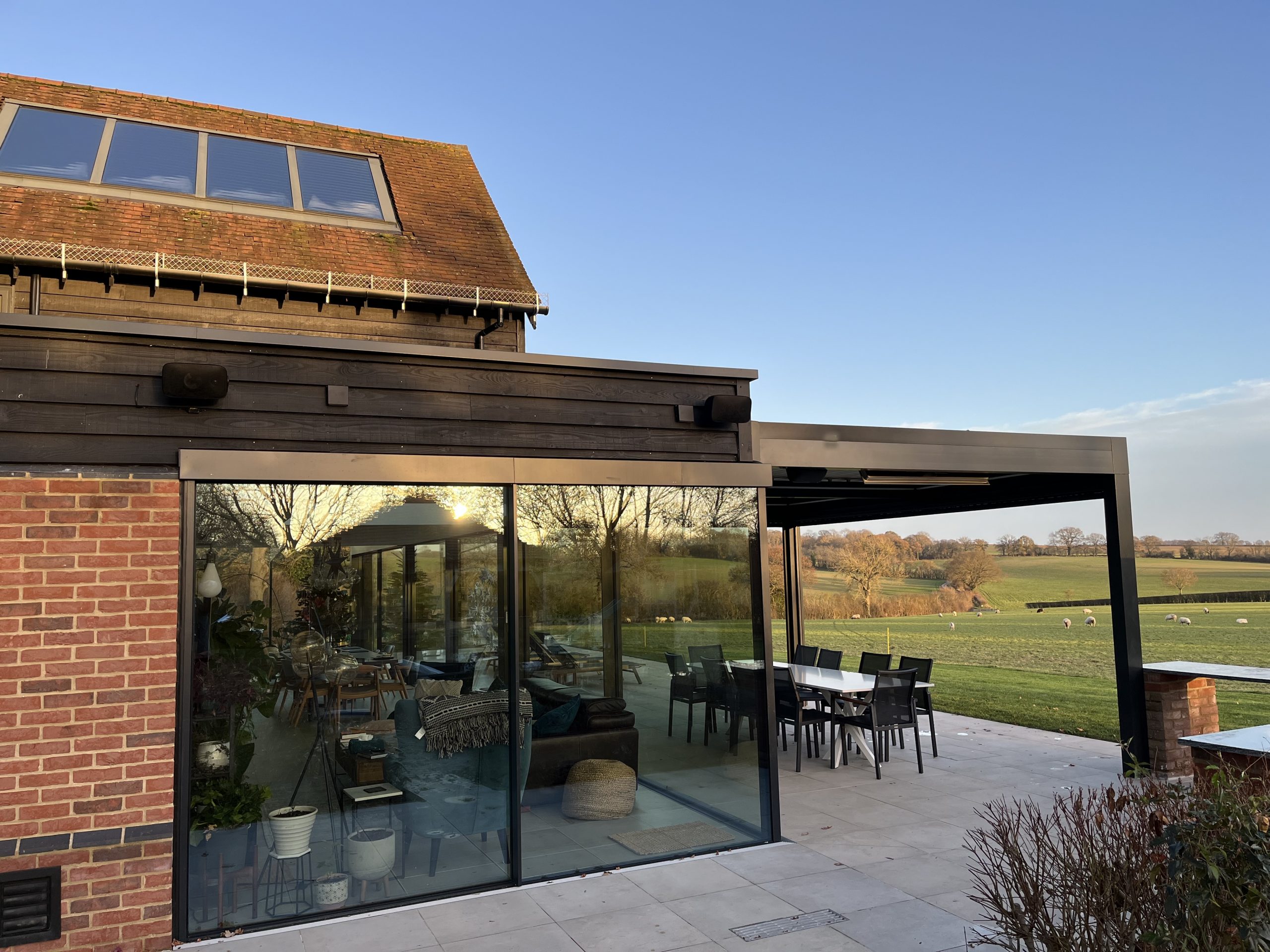 This is a private residence set within the Hertfordshire countryside. The works consisted of extending the property along the rear elevation, enlarging the living area and utility room. The design of the living area with full height glass walls, glass sliding doors and a glass roof makes the most of the stunning views of the countryside. Furthermore, the floor and terrace finishes match, which adds to the seamless link from inside to out. The works also involved adding solar panels to the outbuildings and upgrading the ground source heat pump. These additions as well as the solar gain of the extension will help the property run more efficiently.