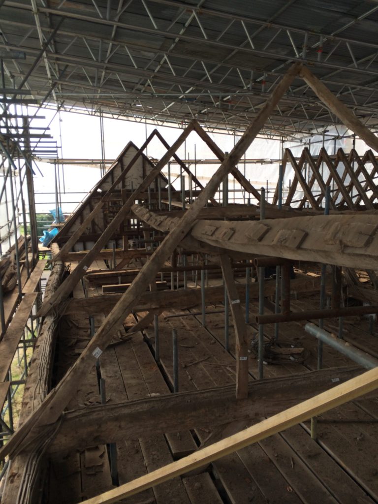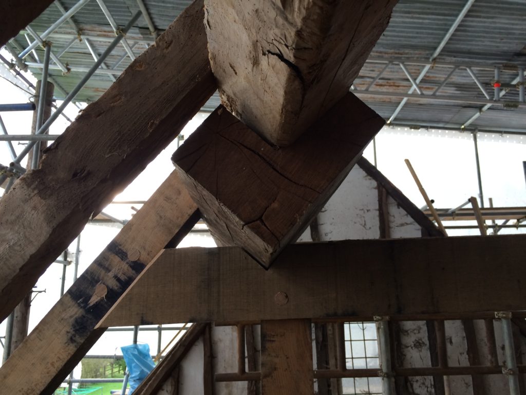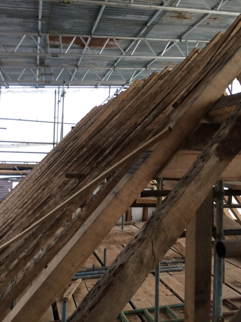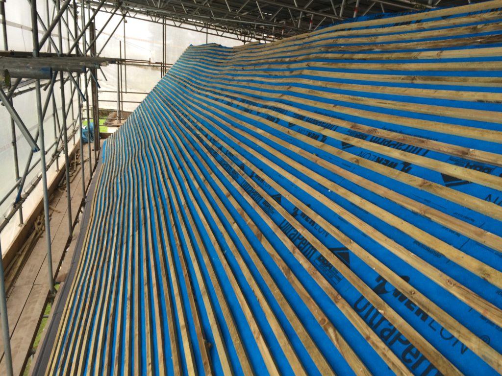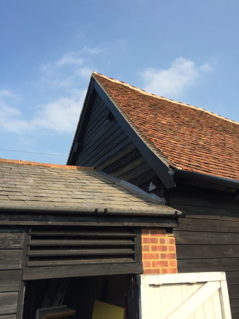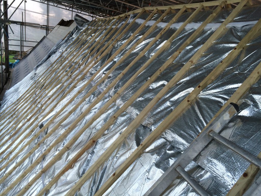 The original barn had become structurally unstable and an insurance company was brought in to administer the repairs. The schedule of works was agreed with the structural engineer and the insurance company. This involved the removal of all tiles and structural repairs to numerous oak rafters and some of the oak trusses. Whilst in construction the client carried out betterment works and we introduced a multi-layered roof insulation which enabled us to keep the ridge height at the existing level whilst keeping the rafters exposed to the underside.