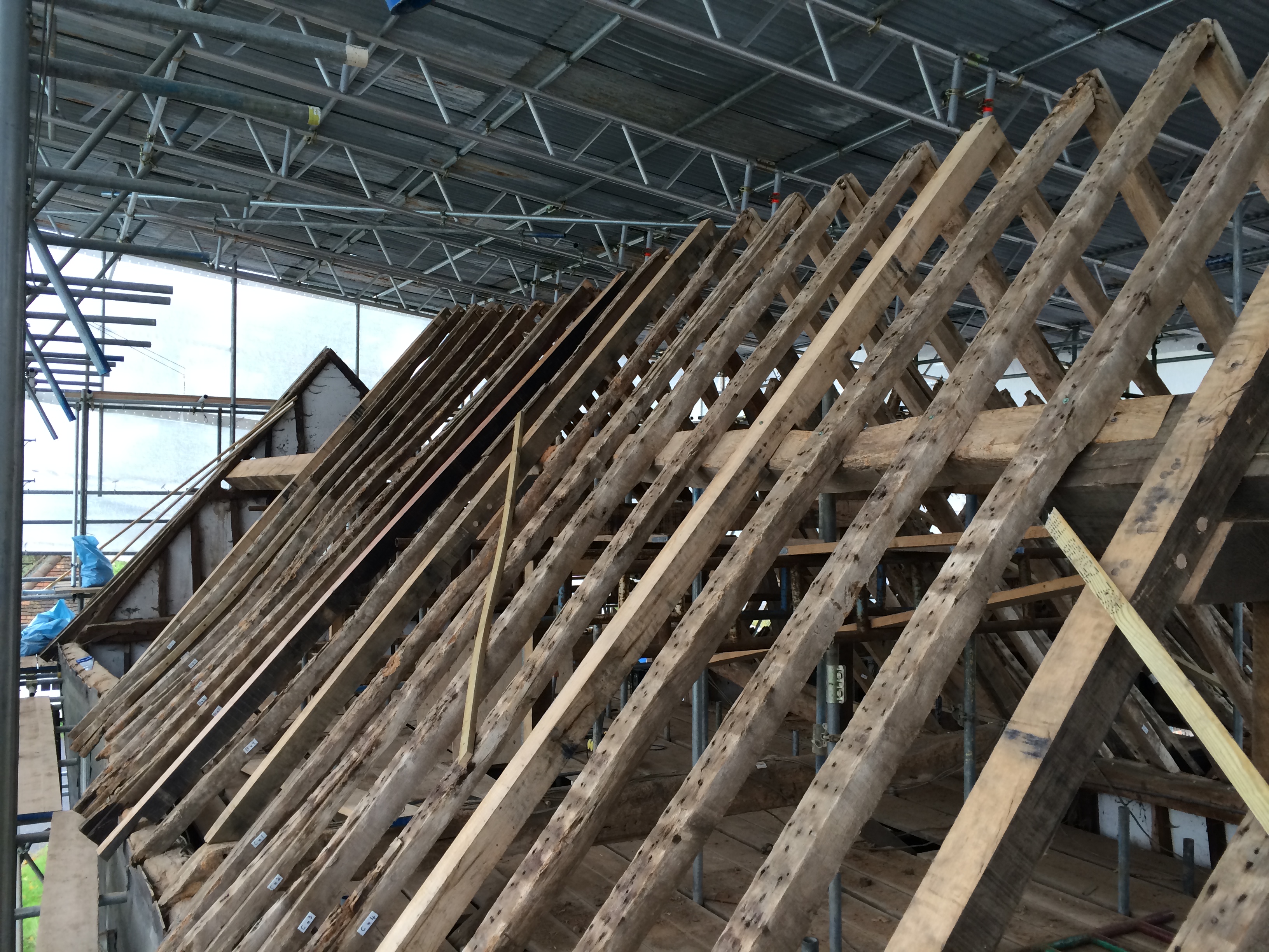 The original barn had become structurally unstable and an insurance company was brought in to administer the repairs. The schedule of works was agreed with the structural engineer and the insurance company. This involved the removal of all tiles and structural repairs to numerous oak rafters and some of the oak trusses. Whilst in construction the client carried out betterment works and we introduced a multi-layered roof insulation which enabled us to keep the ridge height at the existing level whilst keeping the rafters exposed to the underside.